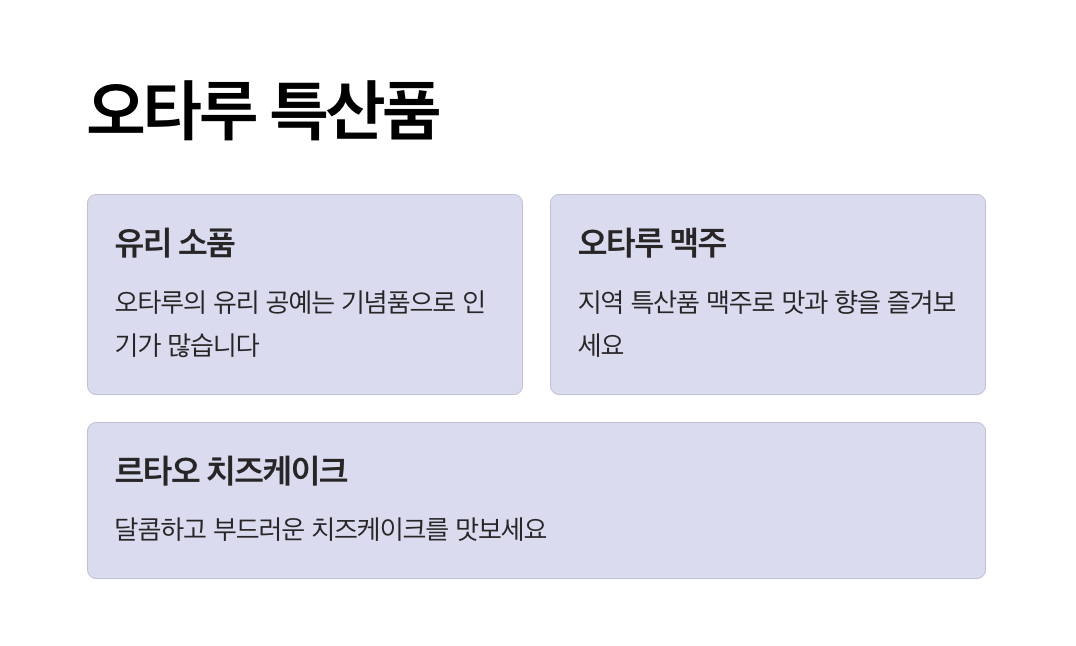 - 소개: 오타루의 유명 디저트 브랜드 르타오의 치즈케이크, 초콜릿 등 제품 소개와 매장 위치를 확인할 수 있습니다.