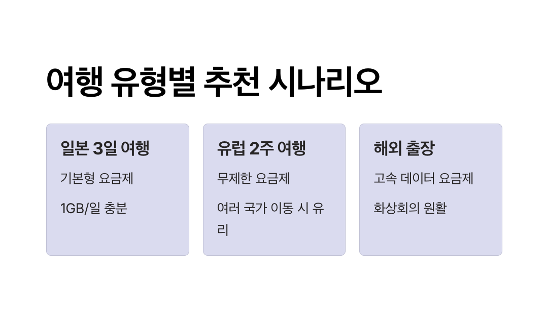 여행 일정과 목적이 다르면 필요한 데이터도 다릅니다. 아래는 여행자 유형별로 가장 효율적인 와이파이도시락 요금제를 추천한 예시입니다.