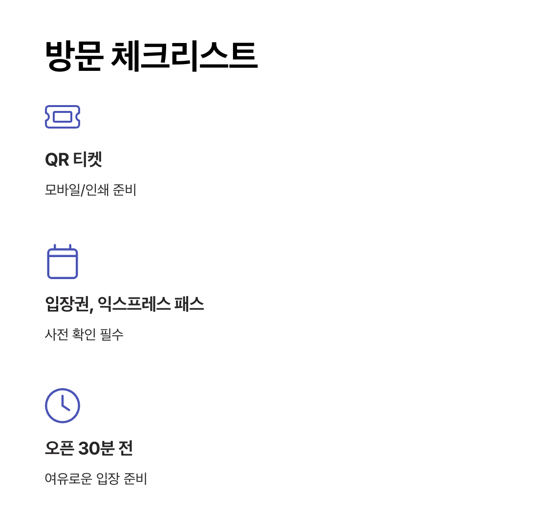 - QR코드 티켓 준비(인쇄본 또는 모바일).