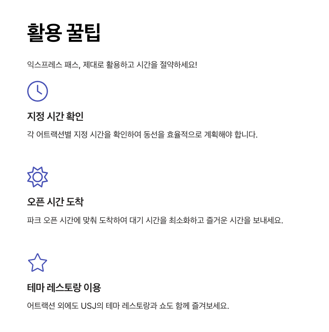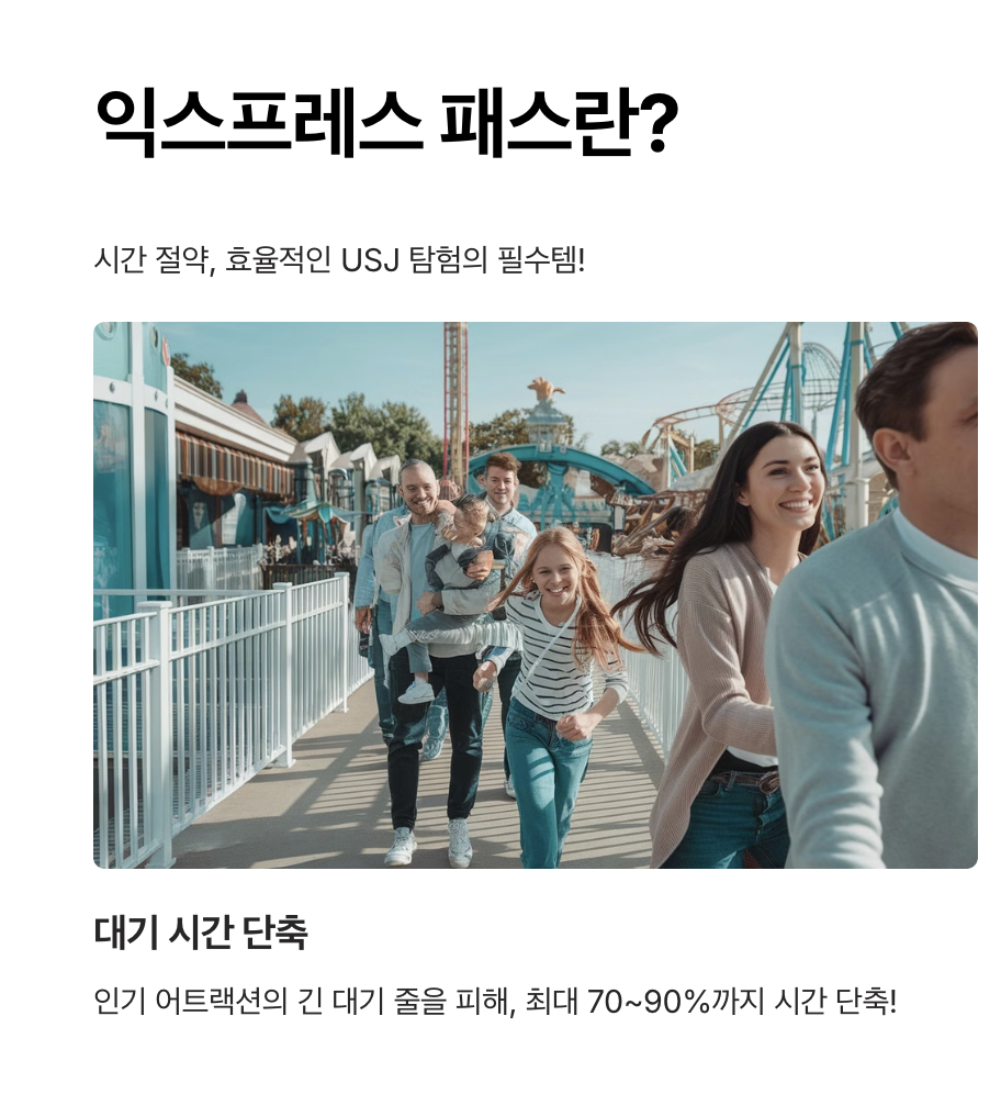 - 익스프레스 패스를 사용하면 긴 대기 없이 주요 어트랙션을 빠르게 즐길 수 있어, 시간 낭비 없이 다양한 즐길 거리를 경험할 수 있습니다.