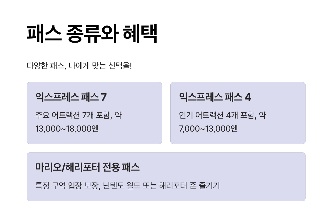 | 익스프레스 패스 7 | 해리포터, 마리오 월드, 미니언즈 등 7개 어트랙션 | 약 13,000~18,000엔 |