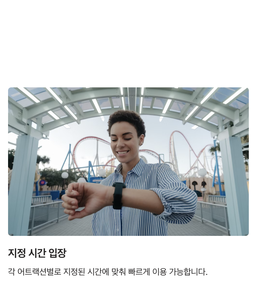 - 일부 어트랙션은 예약된 시간대에만 이용 가능합니다. 패스에 표시된 시간을 꼭 확인하세요.