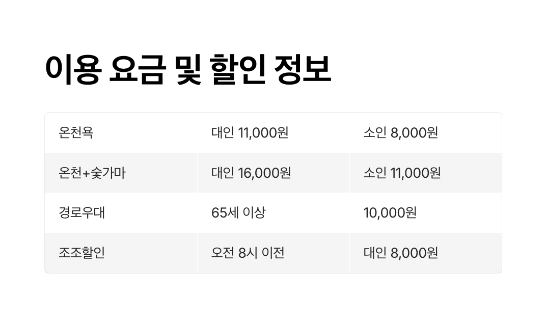 - 경로우대: 만 65세 이상은 온천욕을 10,000원에 이용할 수 있습니다.