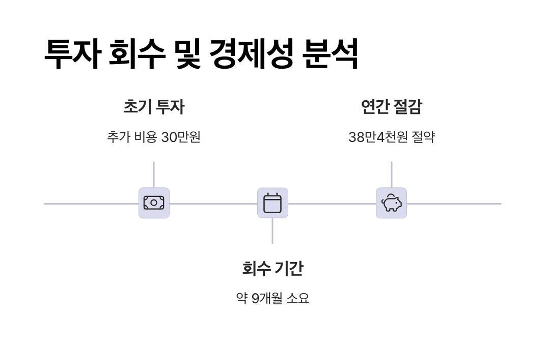 - 분석: 추가 투자 비용 300,000원을 연간 384,000원 절감액으로 나누면, 약 0.78년(약 9개월) 만에 초기 비용을 회수할 수 있습니다.