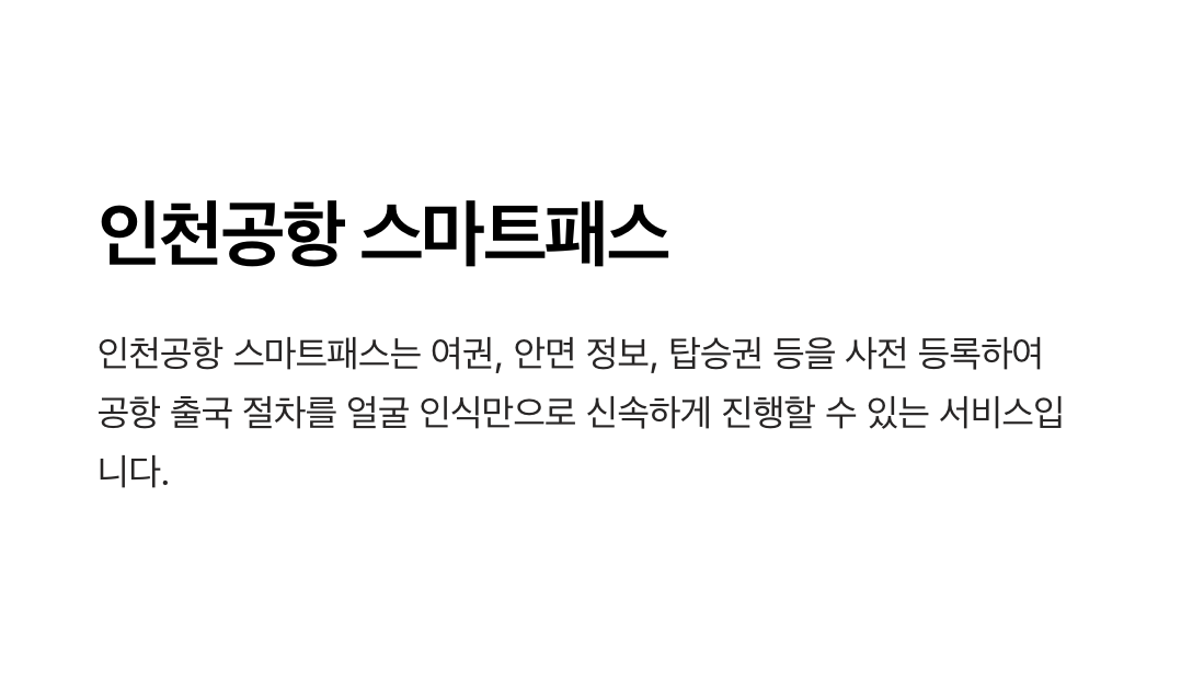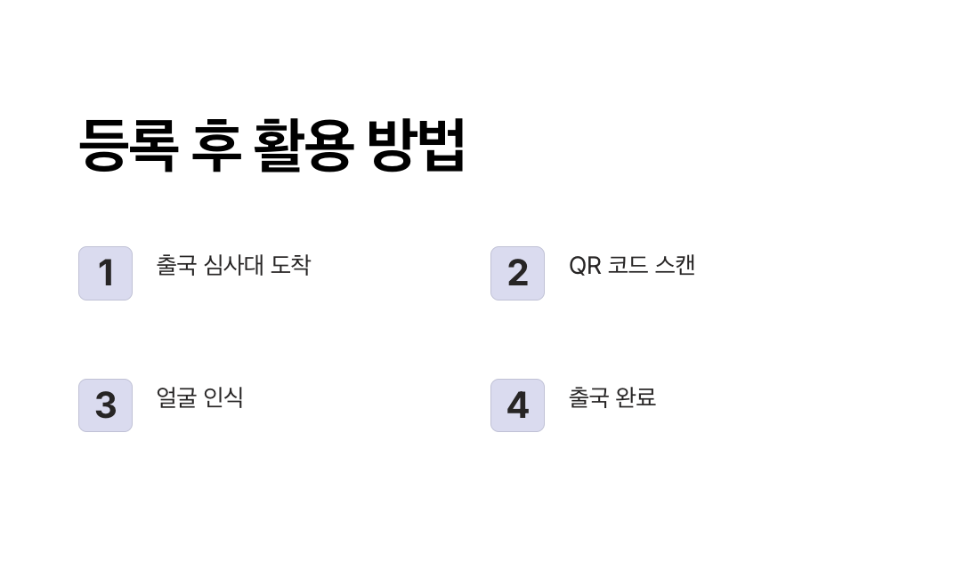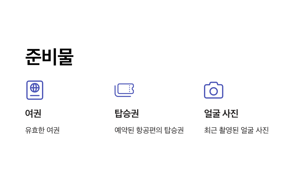 - 여권, 탑승권, 안면 정보를 사전 등록하면 출국장에서 추가 서류 확인 없이 얼굴 인식만으로 출국 절차를 완료할 수 있습니다.