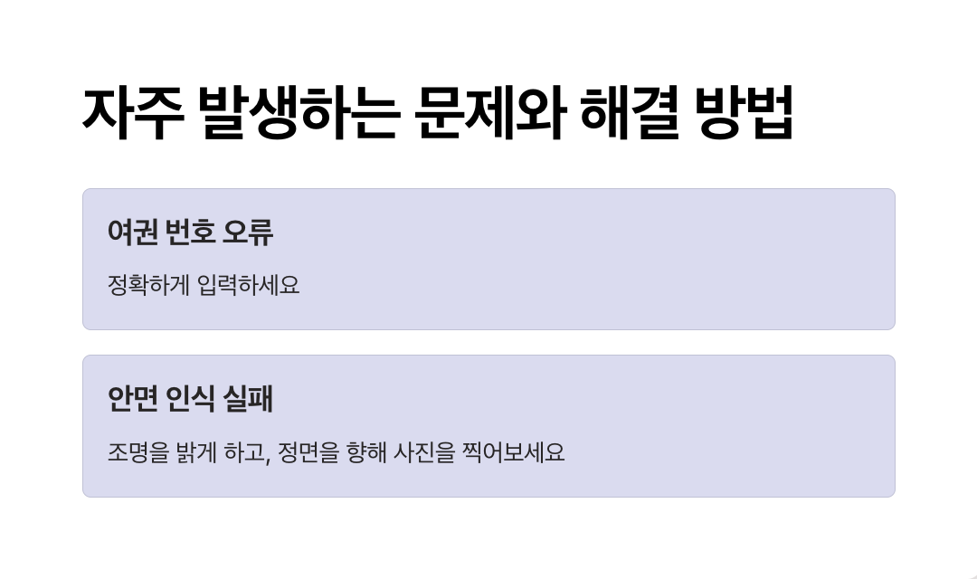 - 여권 사진 면이 깨끗한지 확인하고, 스캔 오류 시 번호를 수동으로 입력하세요.
