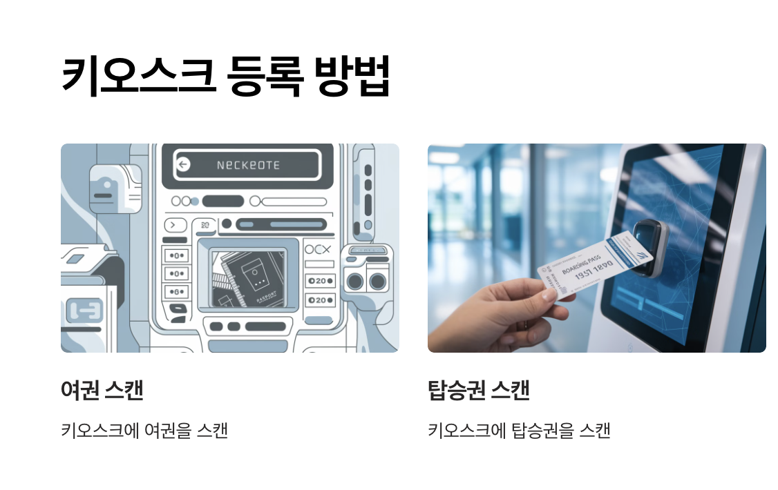 - A4. 모바일 앱은 사전 등록을 집에서 완료할 수 있어 편리하고, 키오스크는 공항 도착 후 바로 등록할 수 있는 장점이 있습니다. 본인의 상황에 따라 선택하세요.