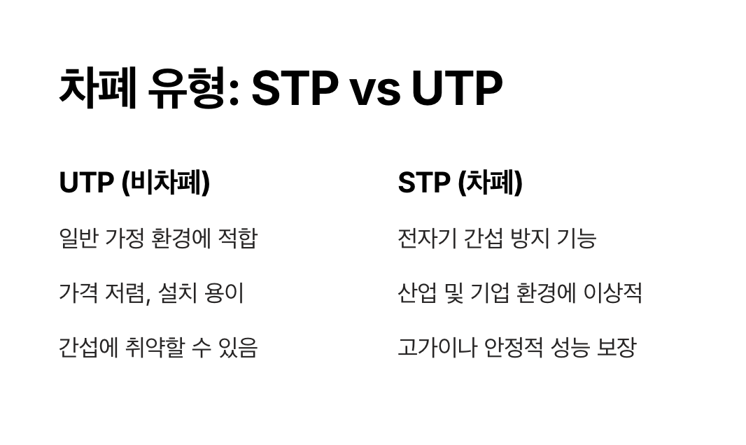 - 차폐 여부: 있음 (UTP 또는 STP)