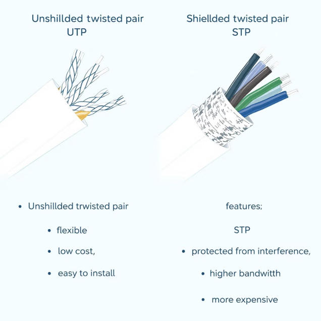 - F/UTP (Foiled with Unshielded Twisted Pair): 전체 차폐만 있음, 가정 및 사무실에 적합