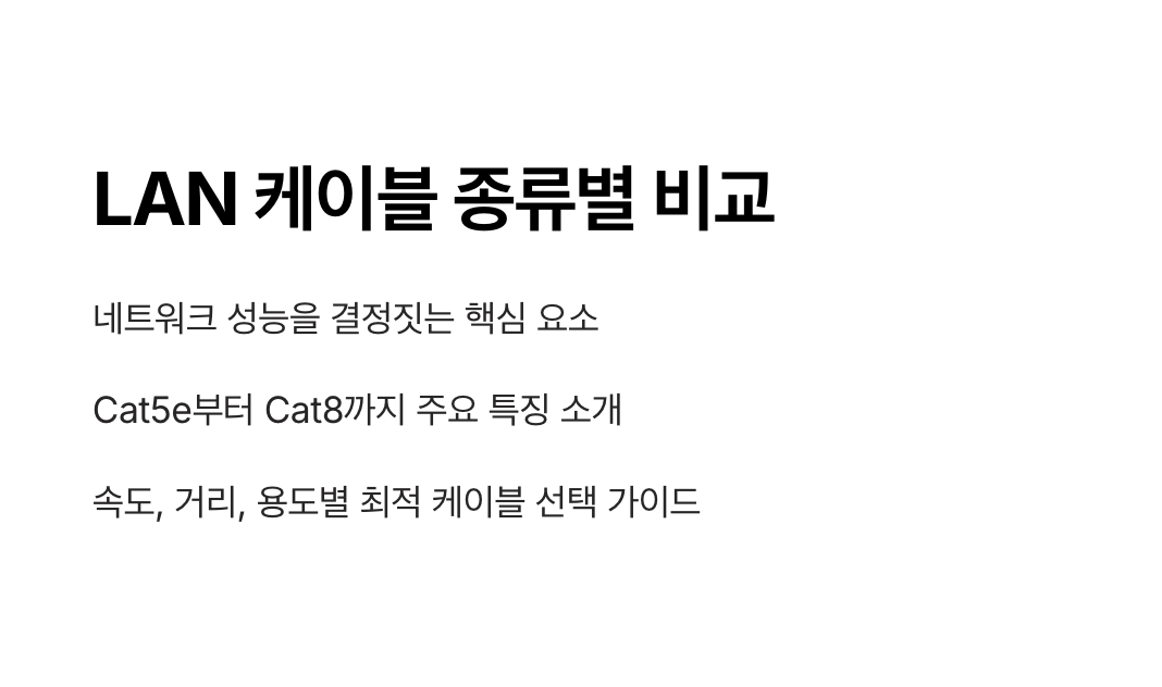 지금까지 다양한 LAN 케이블 종류와 각각의 특성을 살펴보았습니다. Cat5e부터 Cat8까지 속도, 차폐 여부, 가격이 다르므로 인터넷 속도 빠르게 하는 법을 고민하는 사용자라면 환경에 맞게 선택해야 합니다. 아래는 주요 LAN 케이블 속도 비교입니다: