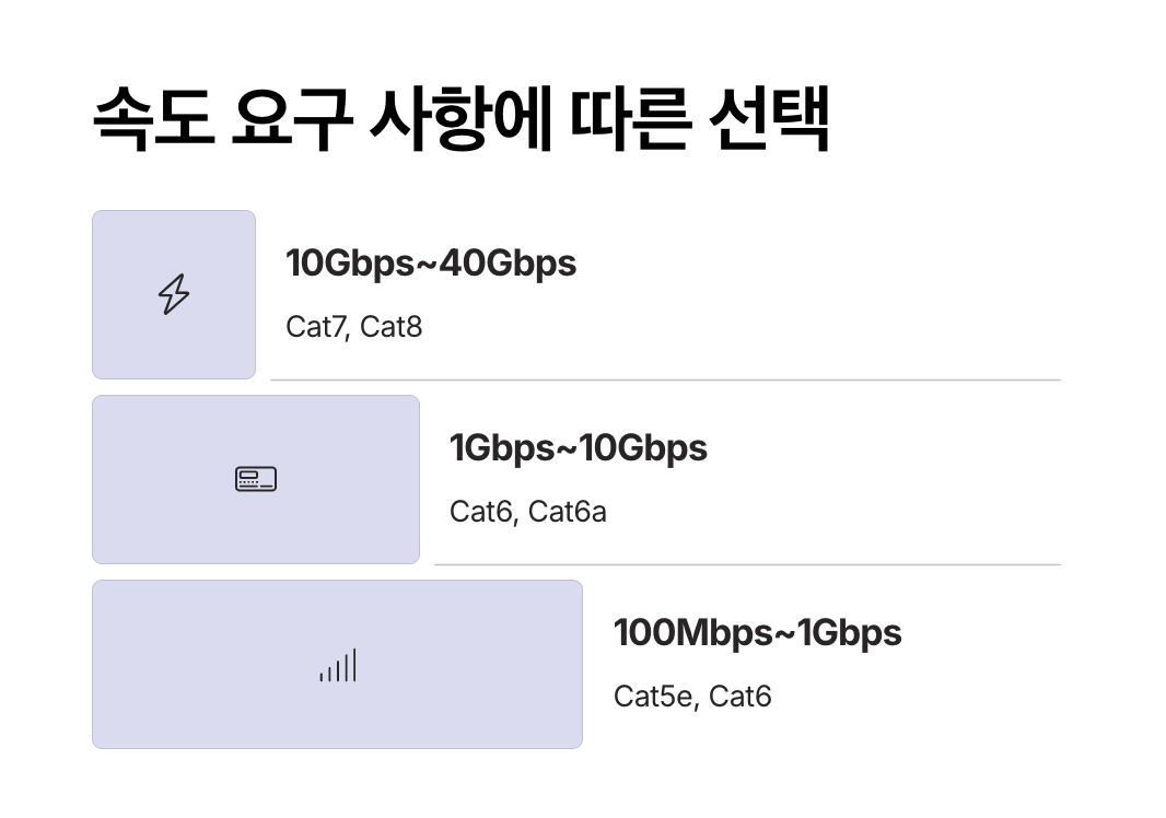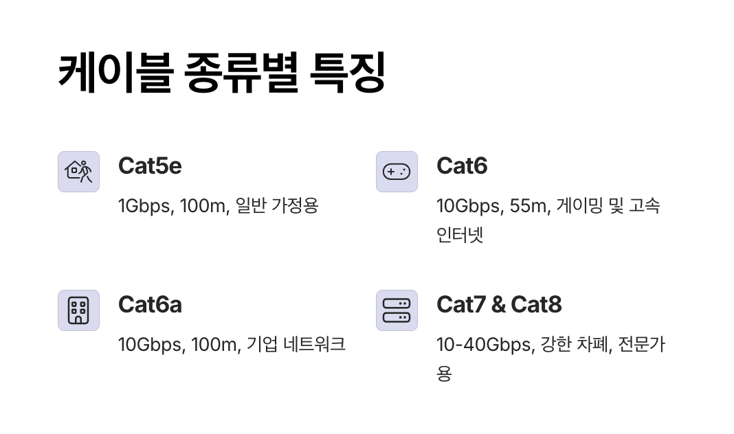 | 일반 가정용 | 100Mbps~1Gbps | Cat5e, Cat6 |