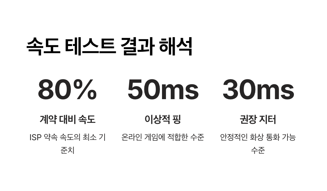 - 한 번의 테스트 결과만으로 속도를 판단하지 말고, 최소 3~5회 반복 측정하여 평균 속도를 확인하는 것이 정확합니다.
