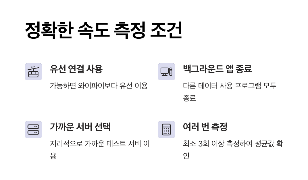 위 조건을 충족한 상태에서 속도를 측정하면 보다 정확한 인터넷 속도 결과를 얻을 수 있습니다.