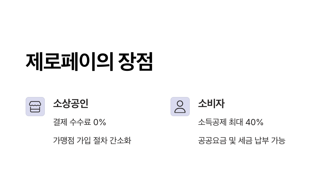 - 제로페이는 소득공제 혜택(최대 40%)을 제공하는 반면, 간편결제 서비스는 소득공제 혜택이 없습니다.