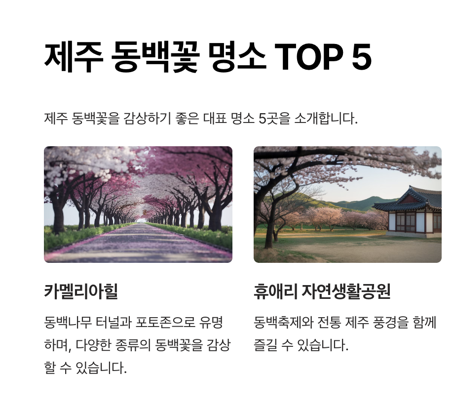 동백꽃은 제주 곳곳에서 만날 수 있지만, 특히 많은 사람들이 찾는 유명 명소들이 있습니다. 아래는 각 명소별 특징과 즐길 거리를 정리한 리스트입니다.