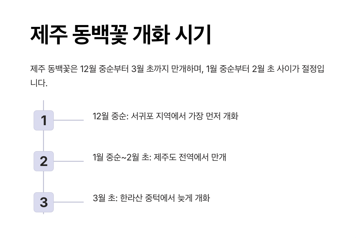 제주도 동백꽃은 일반적으로 12월 중순부터 개화하기 시작해, 1월과 2월이 절정입니다. 하지만 지역에 따라 조금씩 개화 시기가 다를 수 있으니 여행 일정을 세울 때 참고하세요.
