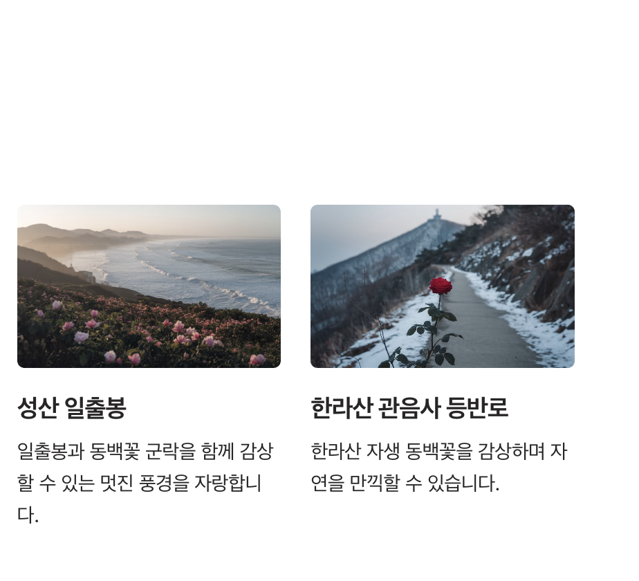 - 카멜리아힐의 동백나무 터널과 포토존, 성산 일출봉의 군락지는 사진 촬영 명소로 유명합니다. 자연광이 좋은 오전 시간을 추천합니다.