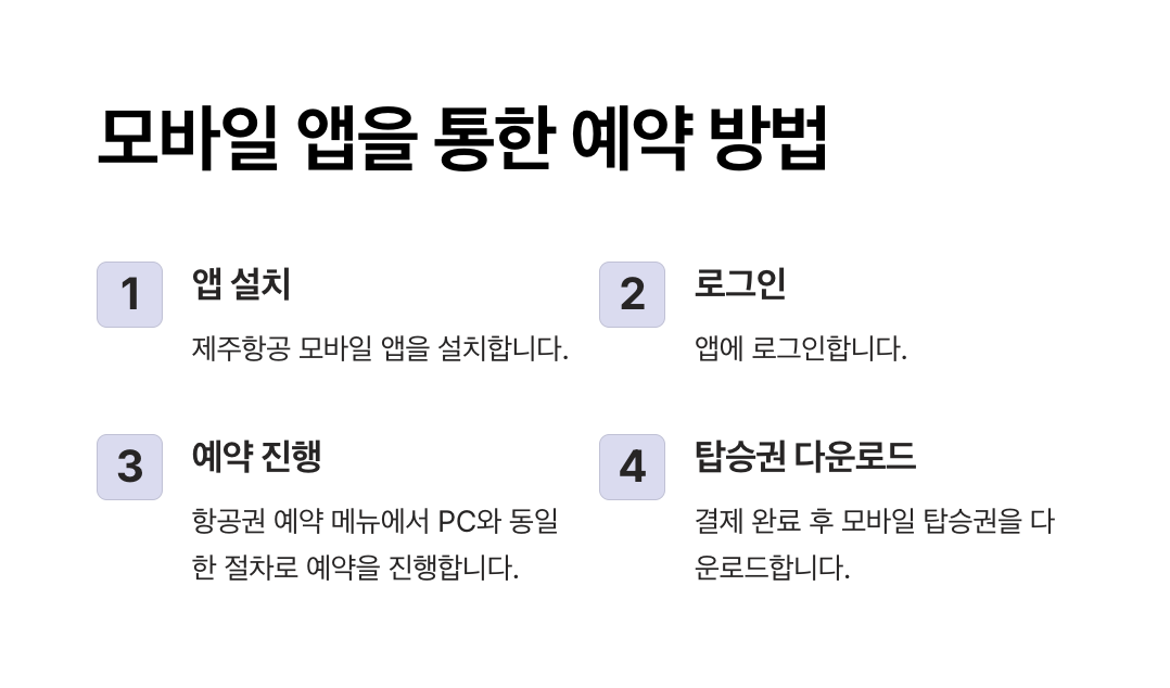 | 2. 제주항공 모바일 앱 다운로드 | 제주항공 모바일 앱을 통해 항공권 예약, 프로모션 알림, 탑승권 다운로드 등 다양한 기능을 이용할 수 있습니다. |