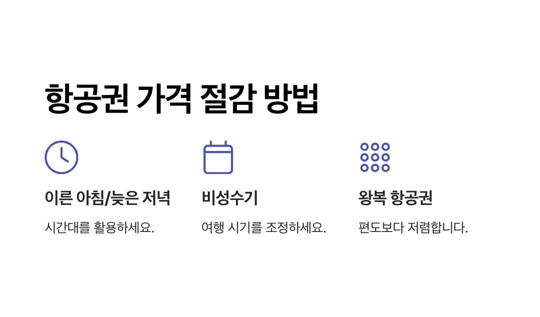 - 비성수기: 화요일, 수요일 같은 비성수기 요일에는 항공권 요금이 저렴합니다.