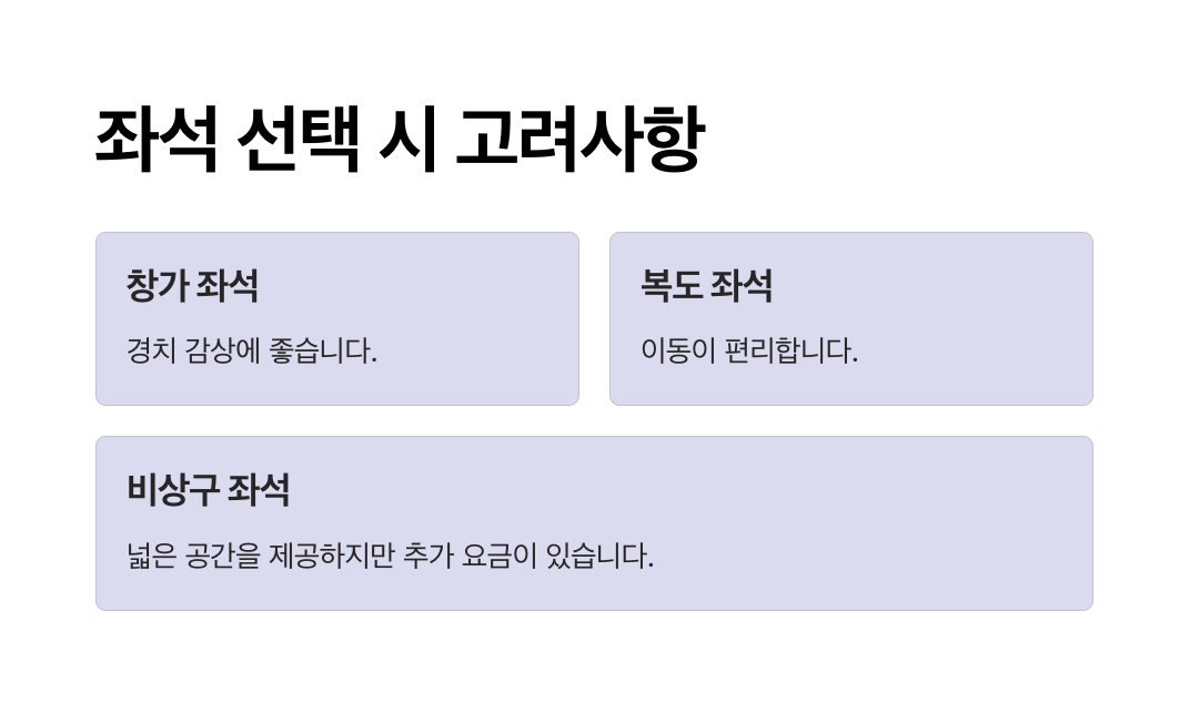- 복도 좌석: 화장실 이용이 잦거나 이동이 많은 경우 복도 좌석이 편리합니다.