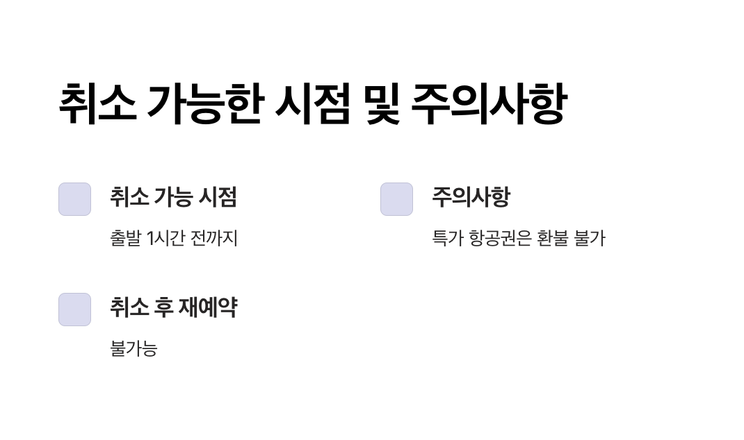 - 출발 1시간 이내 또는 비행기 탑승 후에는 취소 및 환불 불가능.