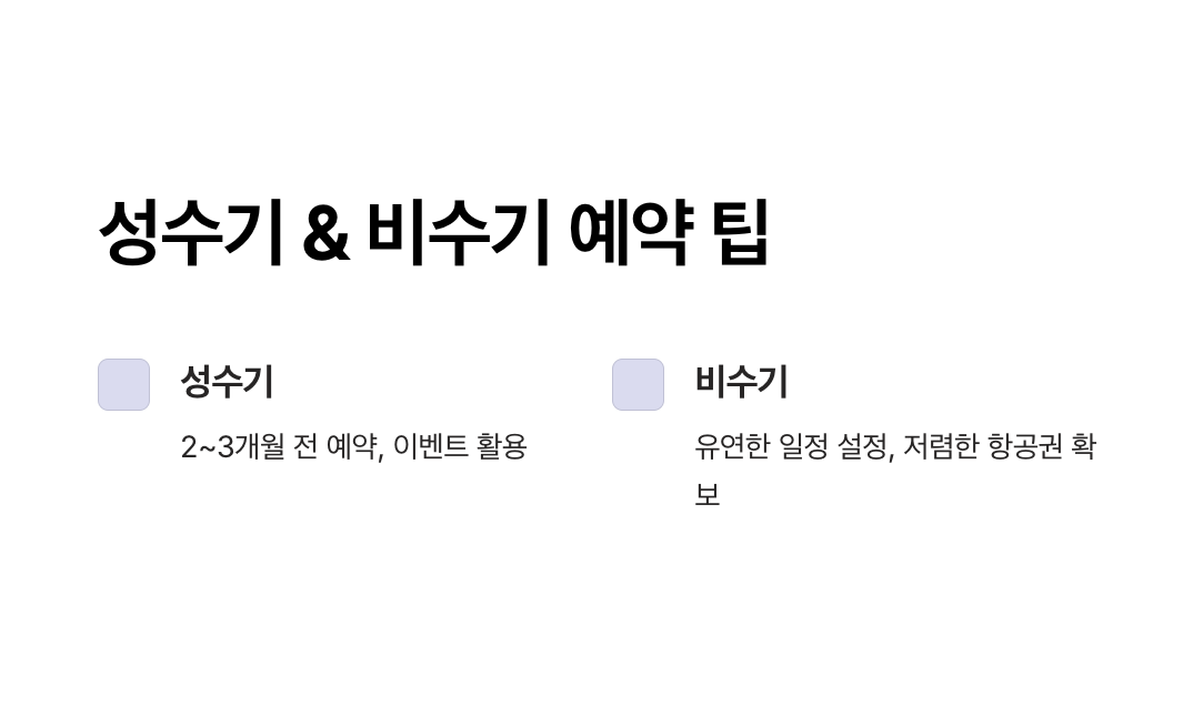 비성수기에는 요일별 가격 차이가 적으므로, 여행 날짜를 유연하게 조정하여 더 저렴한 항공권을 찾으세요. - 할인 이벤트 확인
