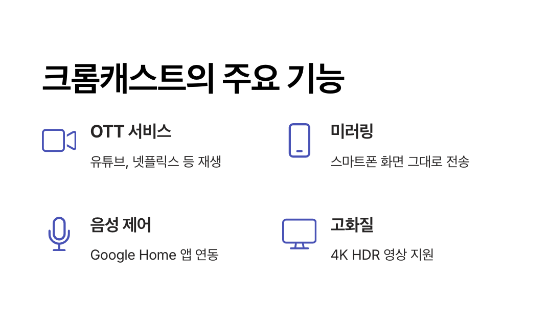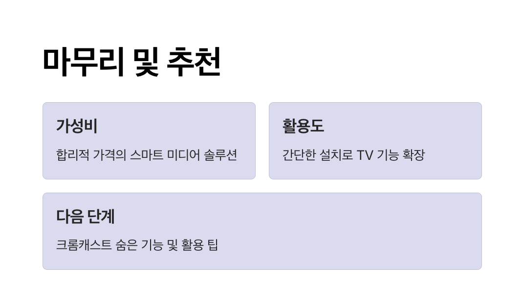 크롬캐스트란 단순한 전송 장치를 넘어, 일반 TV를 스마트하게 바꾸는 강력한 도구입니다. 특히 스마트TV를 구매하지 않아도 OTT 콘텐츠 시청, 화면 공유, 스마트폰 미러링 등을 자유롭게 이용할 수 있다는 점이 가장 큰 매력입니다.
