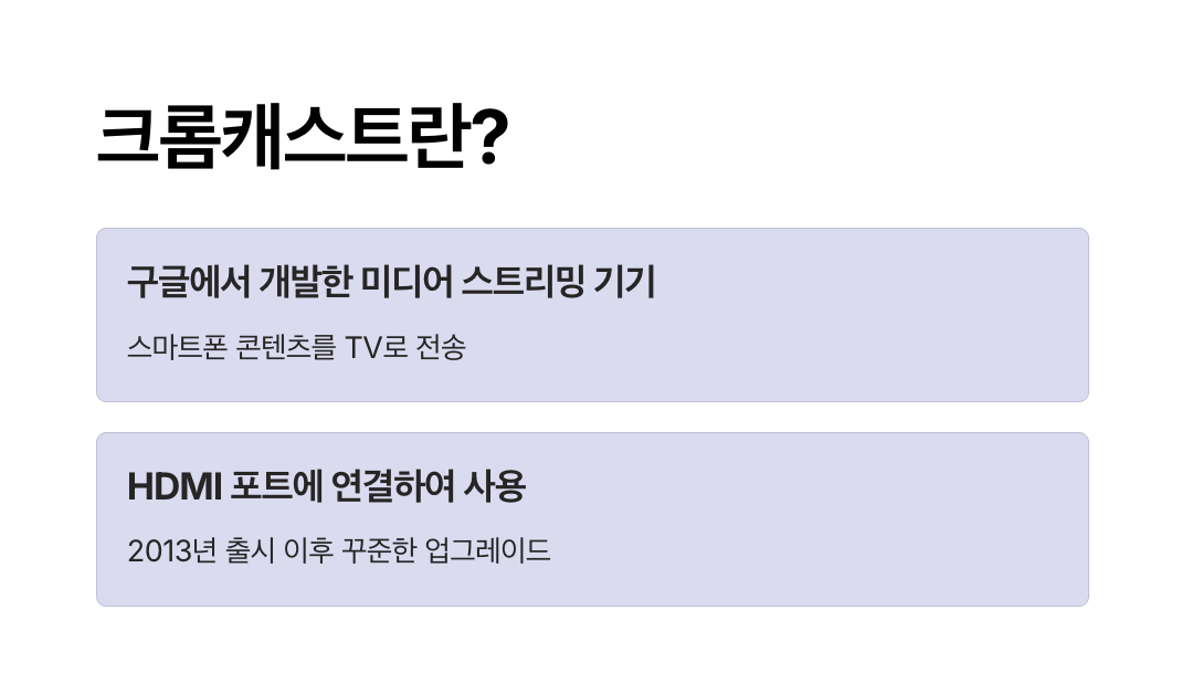 크롬캐스트란 구글(Google)에서 개발한 미디어 스트리밍 기기로, 스마트폰이나 태블릿, PC에서 재생 중인 콘텐츠를 TV 화면으로 전송(cast)해주는 도구입니다. 작은 동글(dongle) 형태의 하드웨어로, TV의 HDMI 포트에 꽂고 Wi-Fi에 연결하면 누구나 쉽게 사용할 수 있습니다.