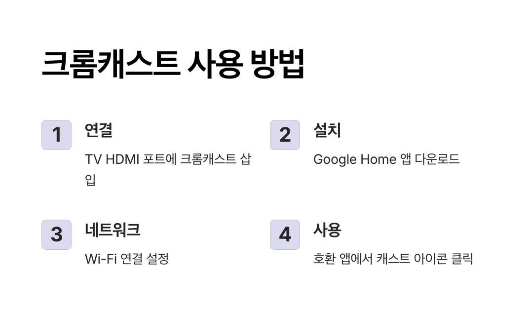 크롬캐스트 사용법은 매우 간단하면서도 직관적입니다. 처음 사용하는 분들도 아래 단계를 그대로 따라 하면 쉽게 설치와 연결을 완료할 수 있습니다.