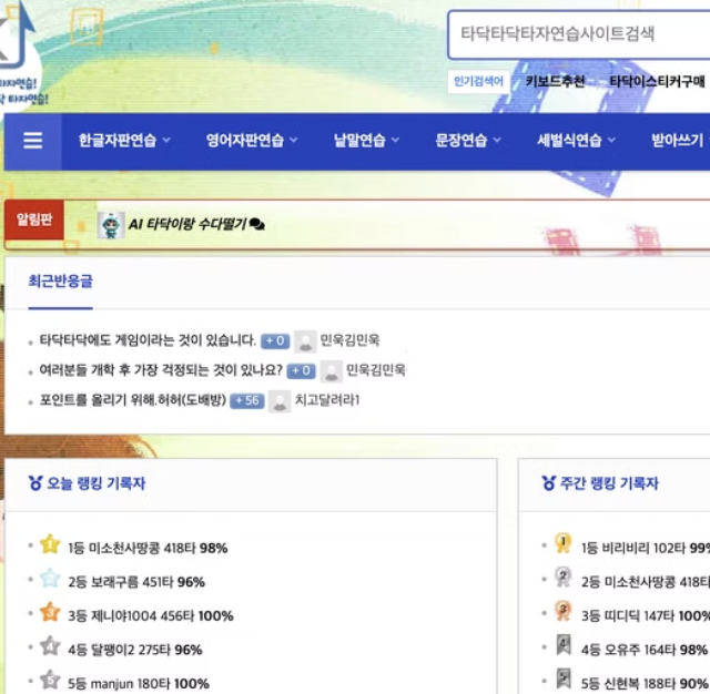 게임처럼 구성된 타자 연습 플랫폼으로, 속도 측정, 점수 저장, 실시간 랭킹 시스템까지 갖춰져 있습니다. 경쟁심을 자극하며 몰입감이 높습니다. - 단점: