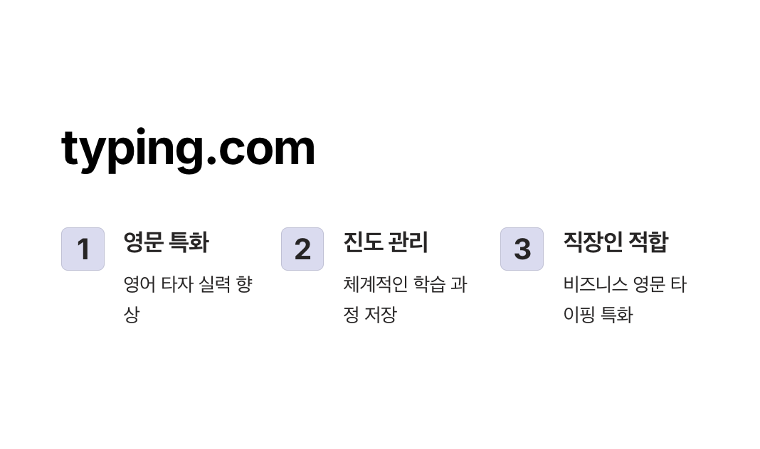 | typing.com | ✅ 있음 | ❌ 없음 | ❌ 부적합 | ✅ 가능 | 직장인, 영문 타자 목적 |