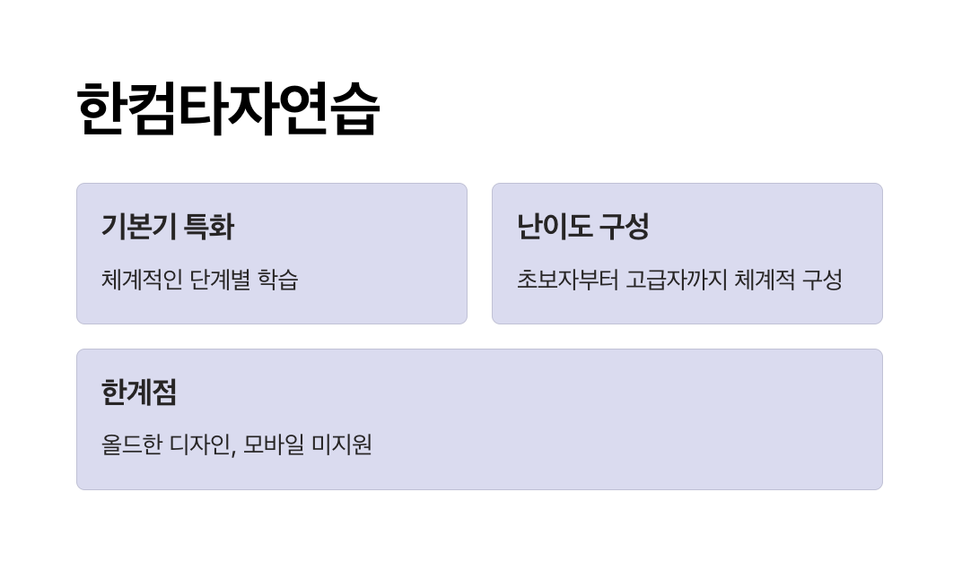 | 한컴타자연습 | ✅ 있음 | △ 낮음 | △ 일부 가능 | ❌ 불가 | 전 연령층, 기본기 연습용 |