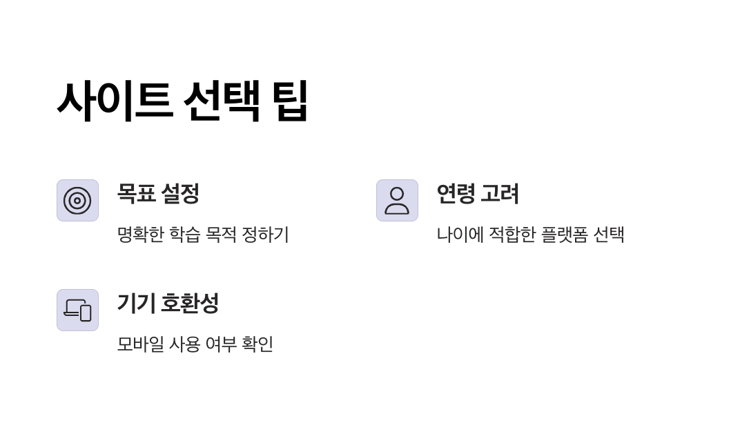 각 사이트는 성격이 조금씩 다르기 때문에, 연령대와 학습 목적에 따라 잘 선택하는 것이 중요합니다.
