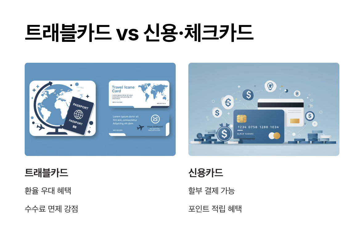 | 비교 항목 | 트래블카드 | 신용카드 | 체크카드 |