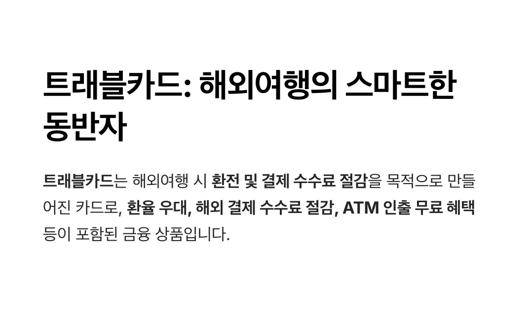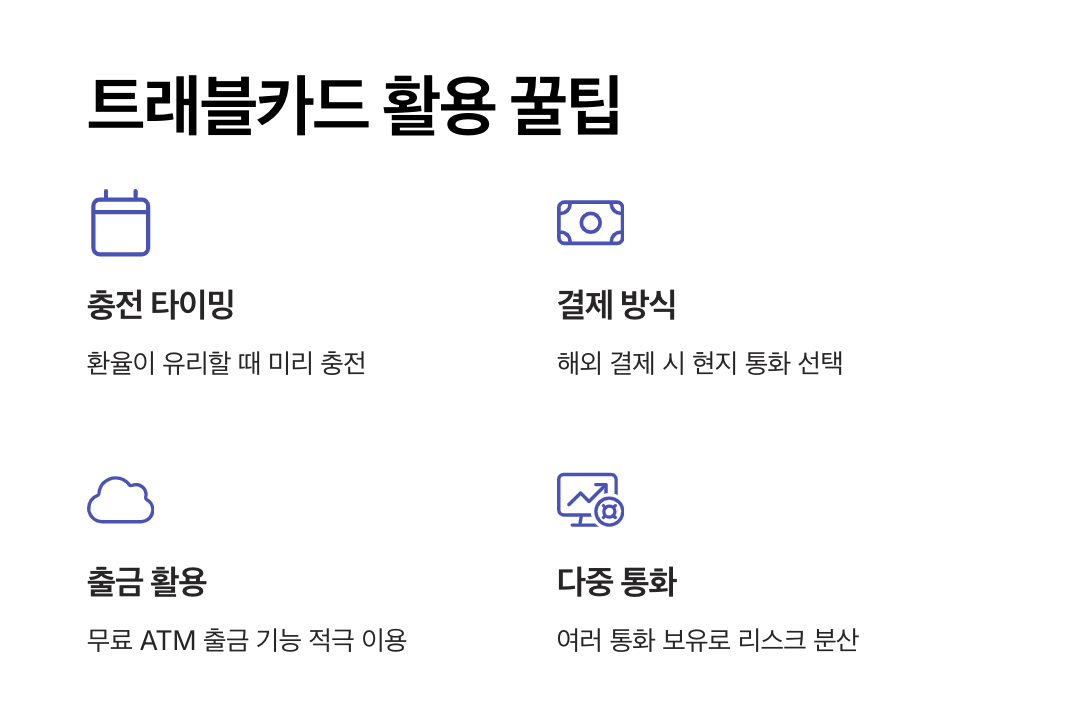 - 트래블카드는 실시간 환율로 충전되므로, 환율이 낮을 때 미리 충전해 두면 여행 중 환전 비용을 절감할 수 있습니다.