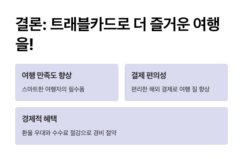 해외여행 시 트래블카드를 활용하면 환전 수수료 절감과 다양한 부가 혜택을 통해 경제적인 여행이 가능합니다. 2025년 현재, 다양한 트래블카드가 출시되어 있으므로, 개인의 여행 스타일과 필요에 맞는 카드를 선택하는 것이 중요합니다. 이번 글에서 소개한 정보를 참고하여 최적의 트래블카드를 선택하시고, 더욱 풍성하고 경제적인 해외여행을 즐기시기 바랍니다.