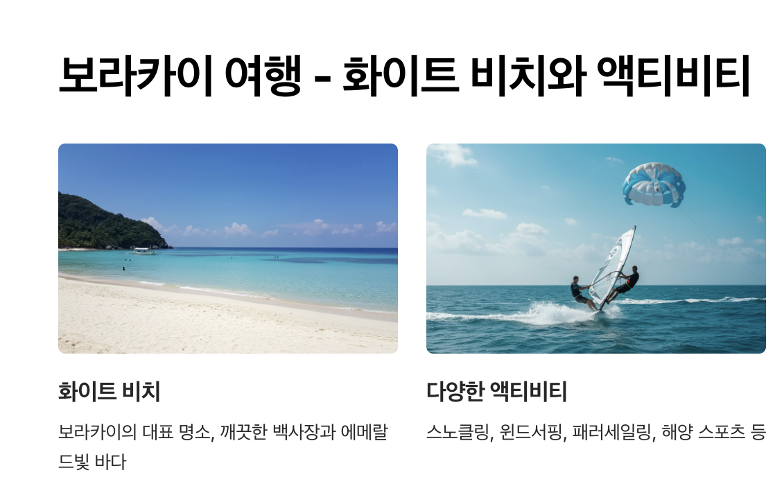 보라카이는 세계적으로 유명한 해변을 자랑하는 휴양지로, 자연과 레저 활동이 조화를 이루는 곳입니다.