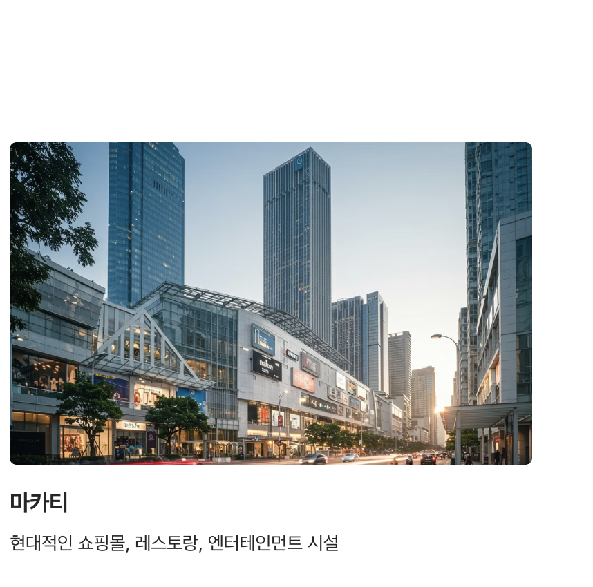 - 마카티와 보니파시오: 마닐라의 현대적인 지역으로, 고급 쇼핑몰과 레스토랑이 밀집한 곳입니다. 마카티의 Ayala Triangle Park는 저녁 산책 코스로 추천합니다.