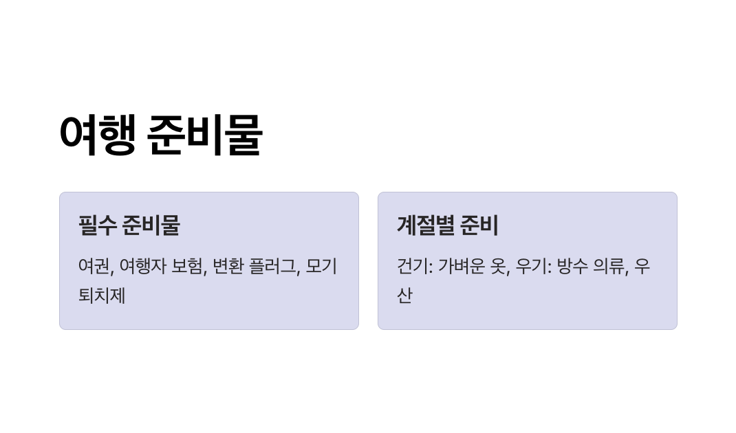 - 우기(6월~10월): 방수 재킷, 접이식 우산.