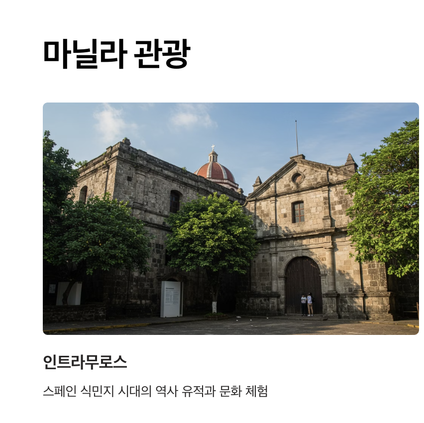 - 인트라무로스 (Intramuros): 스페인 식민지 시대의 흔적을 간직한 도시 안의 요새로, 리살 공원(Rizal Park)과 산 아구스틴 교회(San Agustin Church)를 함께 둘러볼 수 있습니다.