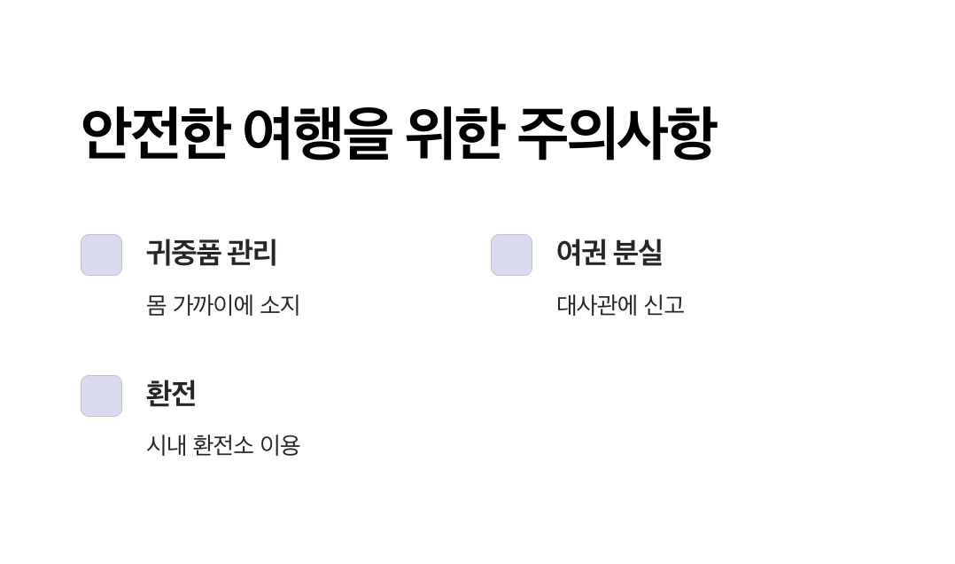 여행 중 예기치 못한 상황이 발생했을 때 대비책을 알아두세요.