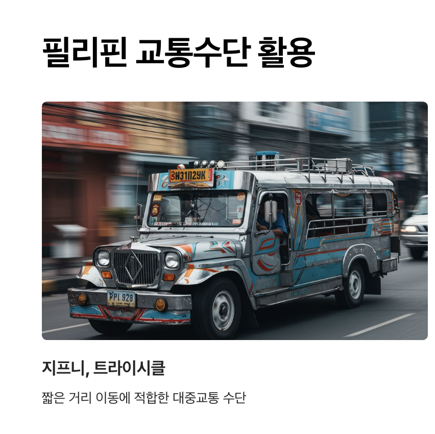 - 필리핀의 대표적인 대중교통 수단으로, 저렴하지만 경로가 복잡할 수 있습니다.