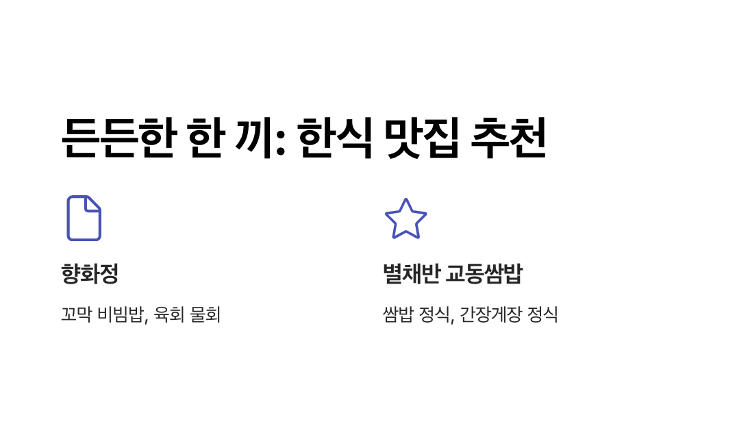 - 특징: 청정 농산물로 만든 반찬과 쌈 채소가 제공되는 건강한 한식당