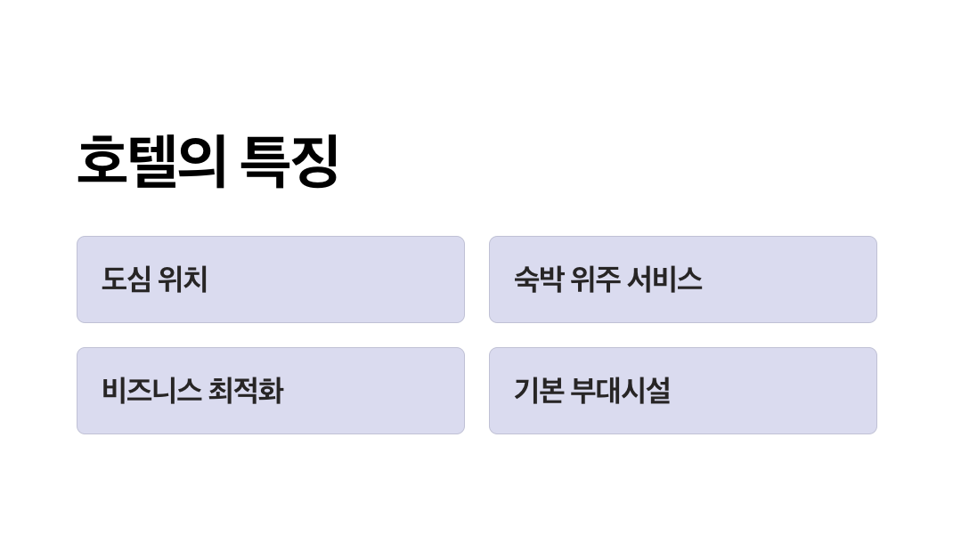 | 주요 고객층 | 비즈니스맨, 1~2일 관광객 | 가족, 장기 체류 여행객 |