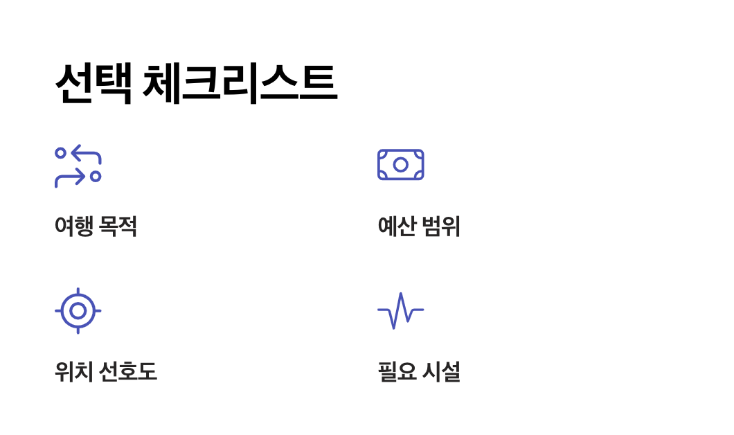 여행 계획을 짤 때 가장 고민되는 것 중 하나가 바로 ‘어디서 잘까?’입니다. 아래 항목들을 체크해 보면, 나에게 맞는 숙소 유형을 훨씬 쉽게 선택할 수 있습니다.