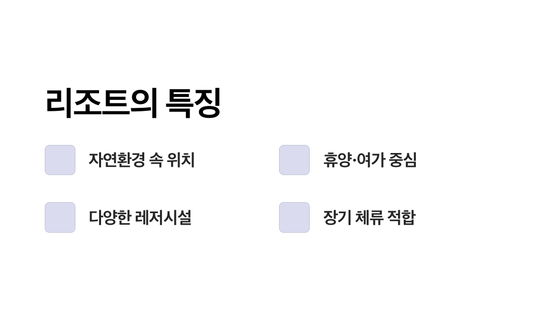 리조트는 ‘머무르며 놀고 쉴 수 있는 공간’입니다. 주로 자연이 풍부한 바닷가, 산속, 외곽 지역에 위치해 있으며, 숙박뿐만 아니라 수영장, 스파, 키즈클럽, 골프장 등 다양한 휴양 시설이 함께 있습니다.