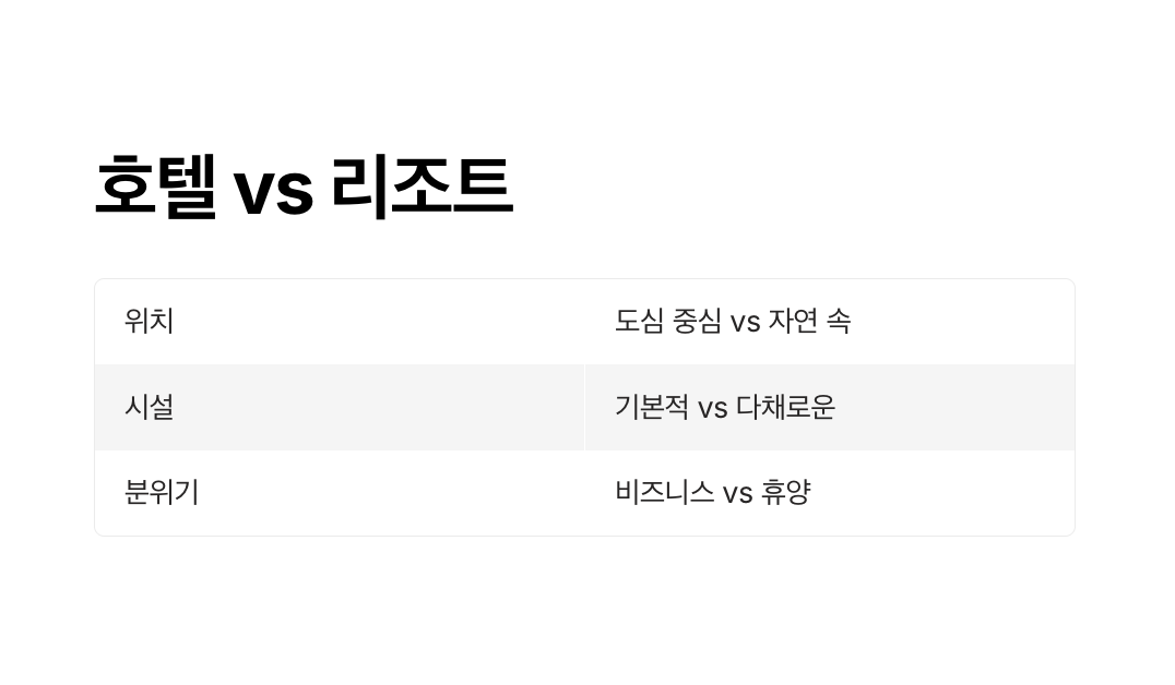 호텔과 리조트의 차이는 단순히 숙박 형태의 차이만이 아닙니다. 여행의 목적, 일정, 동행인, 예산에 따라 완전히 다른 경험이 될 수 있습니다.