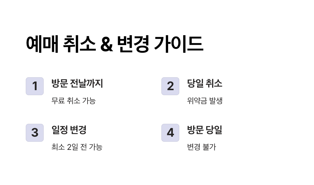 - 방문 당일 일정 변경 불가: 당일에는 변경이 어렵기 때문에 미리 계획을 확정하는 것이 중요합니다.