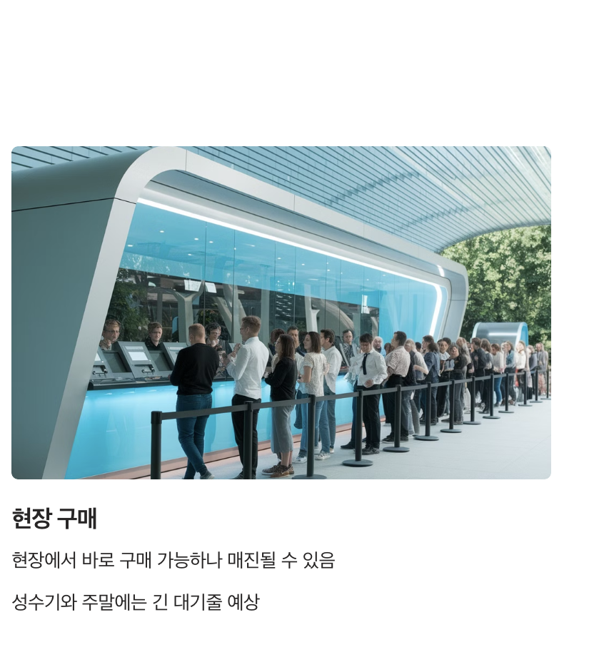 - 비성수기에는 당일 예매 및 현장 구매가 가능하지만, 온라인 예매 시 대기 없이 입장할 수 있습니다.
