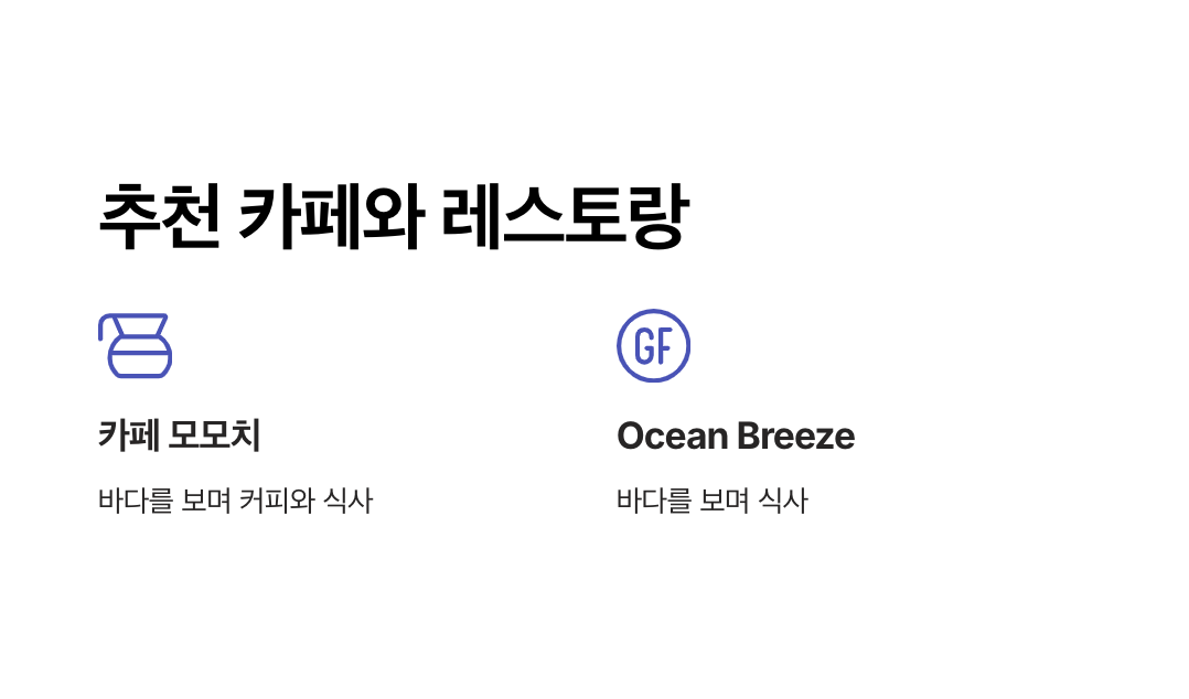 - 카페 모모치: 바다를 바라보며 디저트와 커피를 즐길 수 있는 인기 카페.